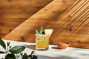 Pour into rocks glasses and garnish with lime wheels, pineapple leaves and sea salt, as desired.